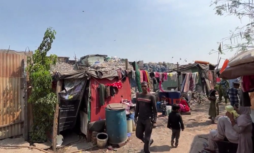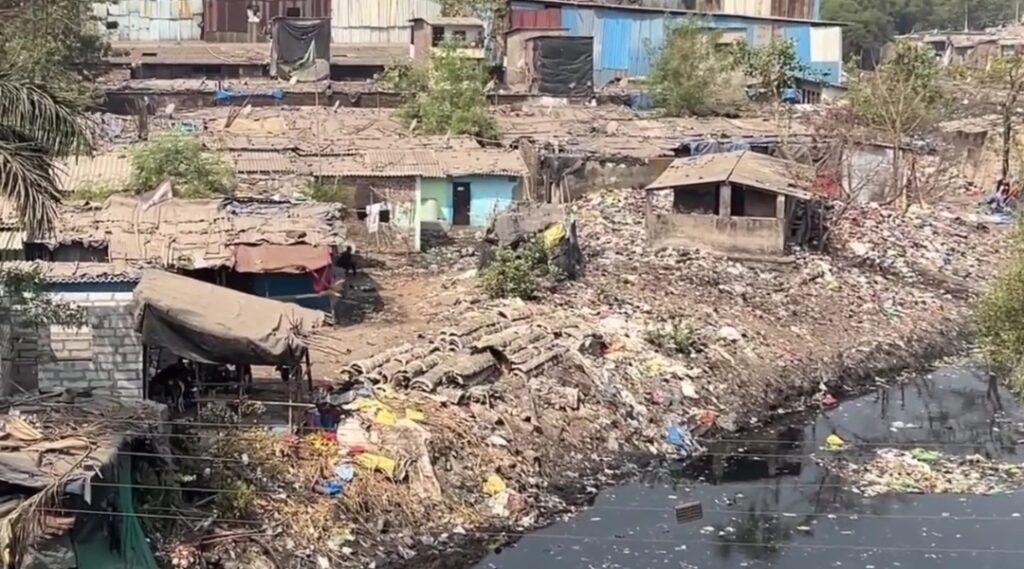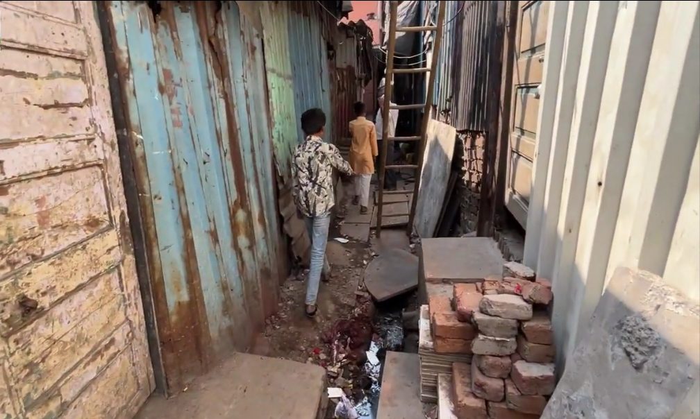 बस्ती में घुसते ही टीन-टप्पर और तिरपाल से ढके छोटे-छोटे घरों की कतार दिखती है। गलियां सकरी हैं और पानी के निकास के लिए बनी नालियां बिल्कुल जाम हो चुकी हैं। दिन का समय होने के बावजूद गली में कीचड़ है — तो सोचिए सुबह का हाल क्या होता होगा। गली से बाहर निकलते ही सामने देवनार डंपिंग ग्राउंड दिखता है। ऐसा लगा जैसे कचरे का यह पहाड़ मेरी छाती पर लाकर किसी ने रख दिया हो।
