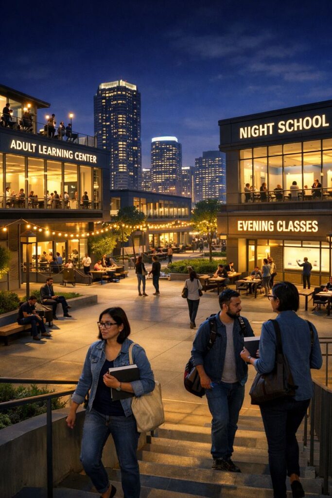 Such districts can host staggered timings, school children in the day, adult learners in the evening, community events, and libraries open into the night. For urban planners, this is efficient land and infrastructure use; for learners, it is a visible statement that the city makes room for education at every hour of life. Accessibility beyond ramps and lifts. Accessibility in night school campuses is often reduced to a checklist of ramps, lifts, and railings. Adult learners, however, carry a wider array of constraints: late work shifts, caregiving responsibilities, age-related fatigue, and in some cases, disabilities obtained through labour.